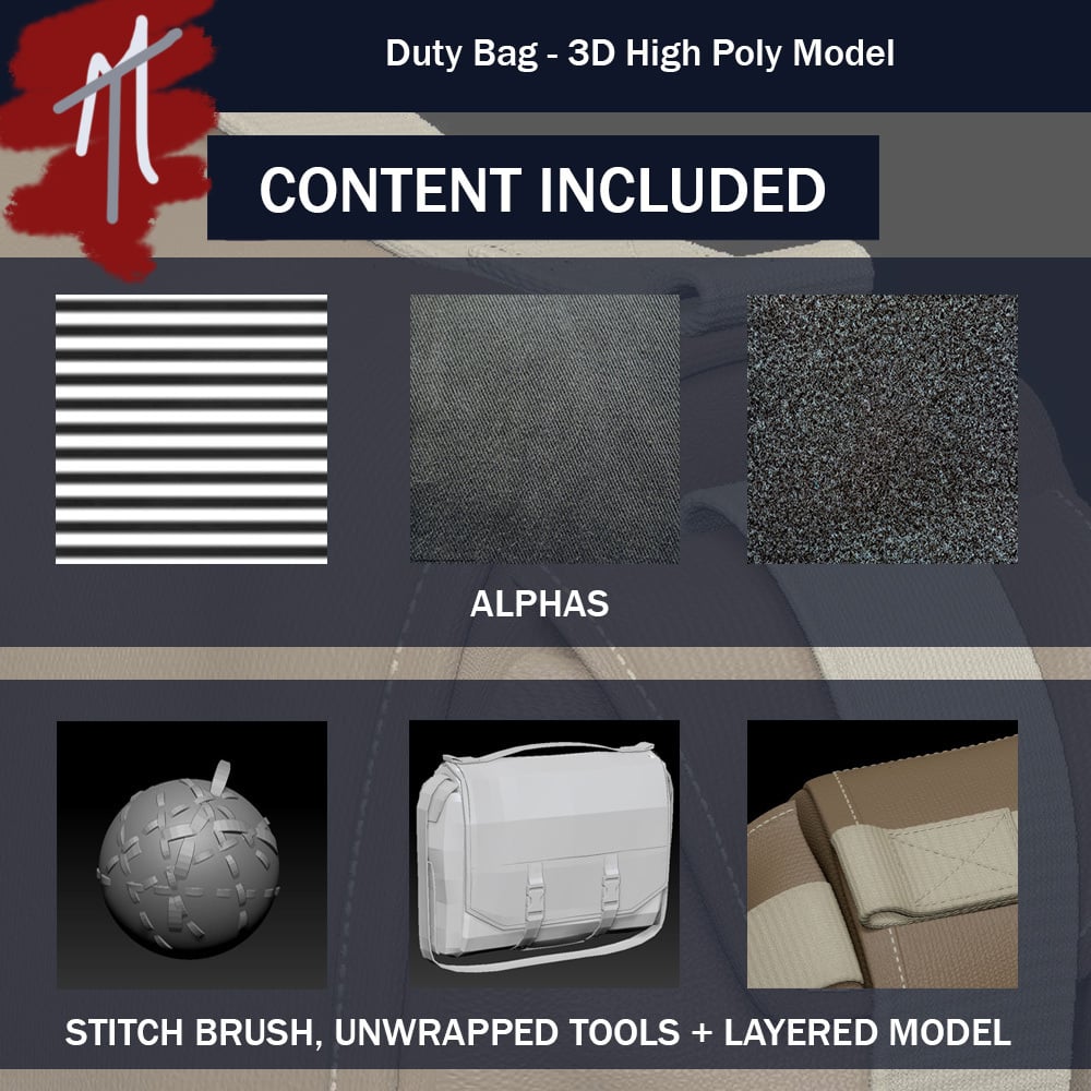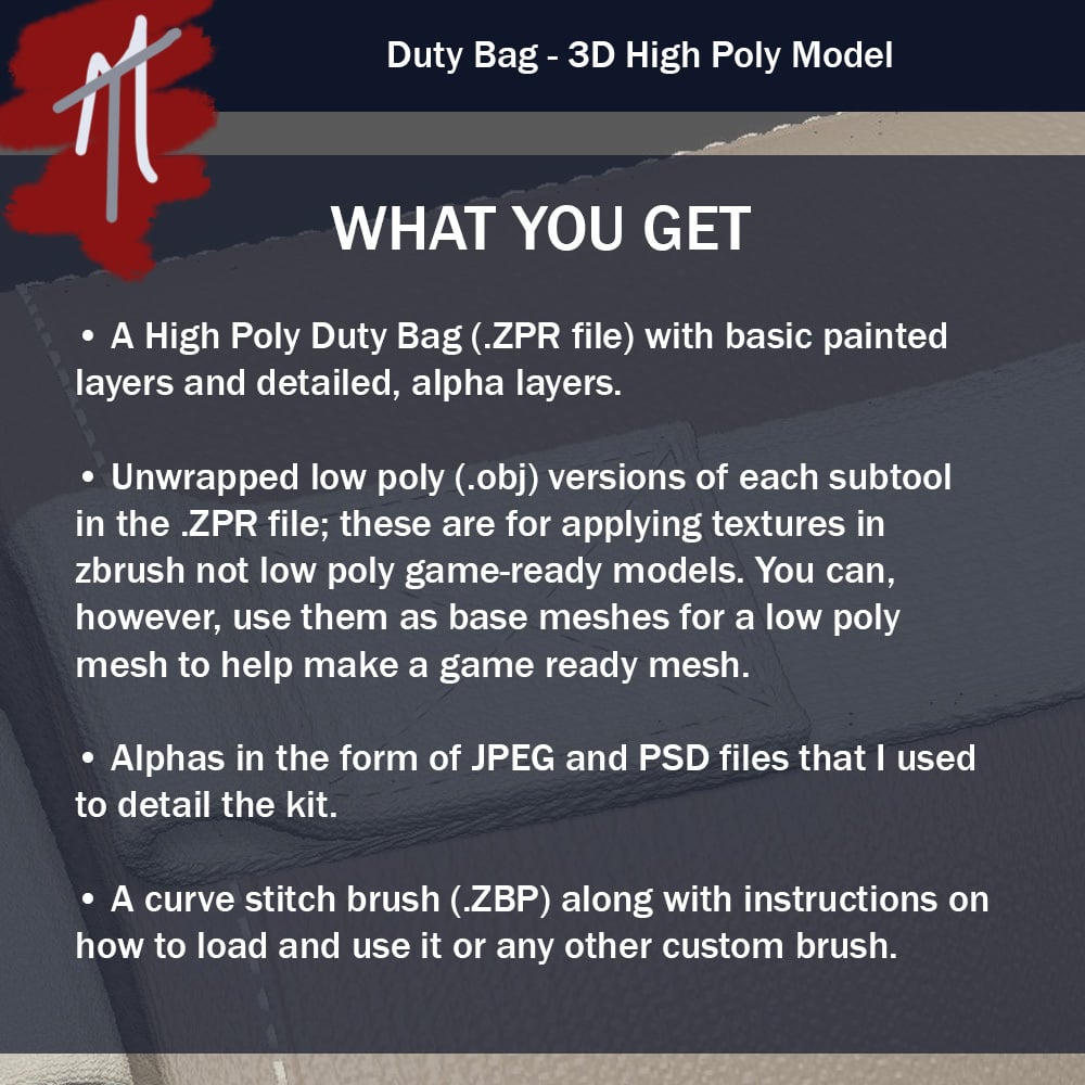 A customizable High Poly Duty Bag modeled in zbrush. The file comes with all the custom alphas and brushes I used to create the model as well as the obj files of the separate pieces of the model.
