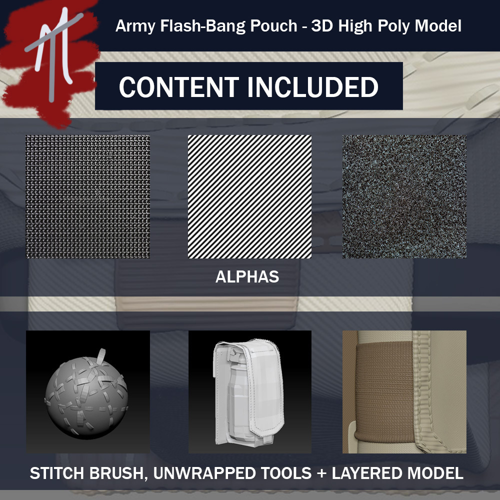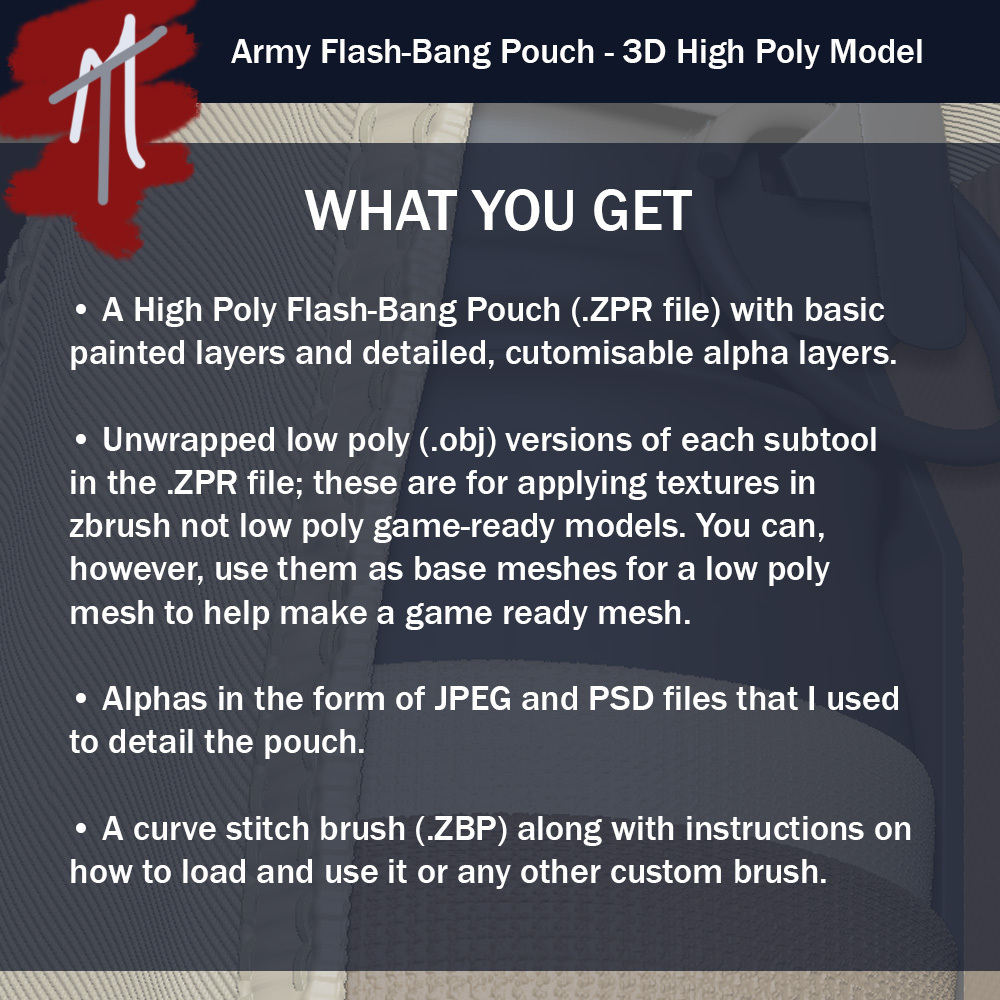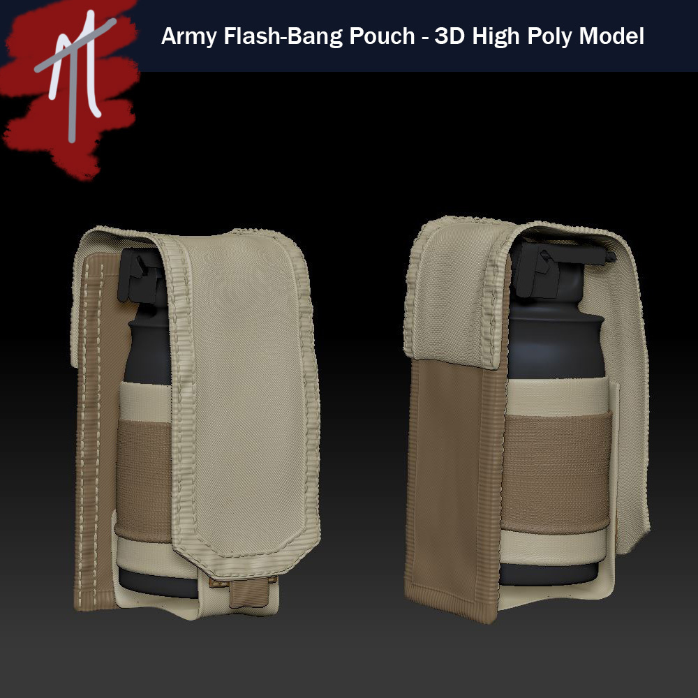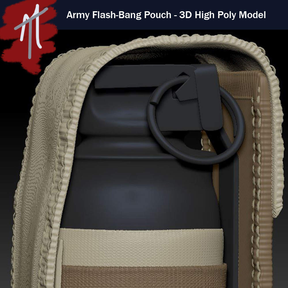 A customizable High Poly flash-bang grenade pouch modeled in zbrush. The file comes with all the custom alphas and brushes I used to create the model as well as the obj files of the separate pieces of the model.